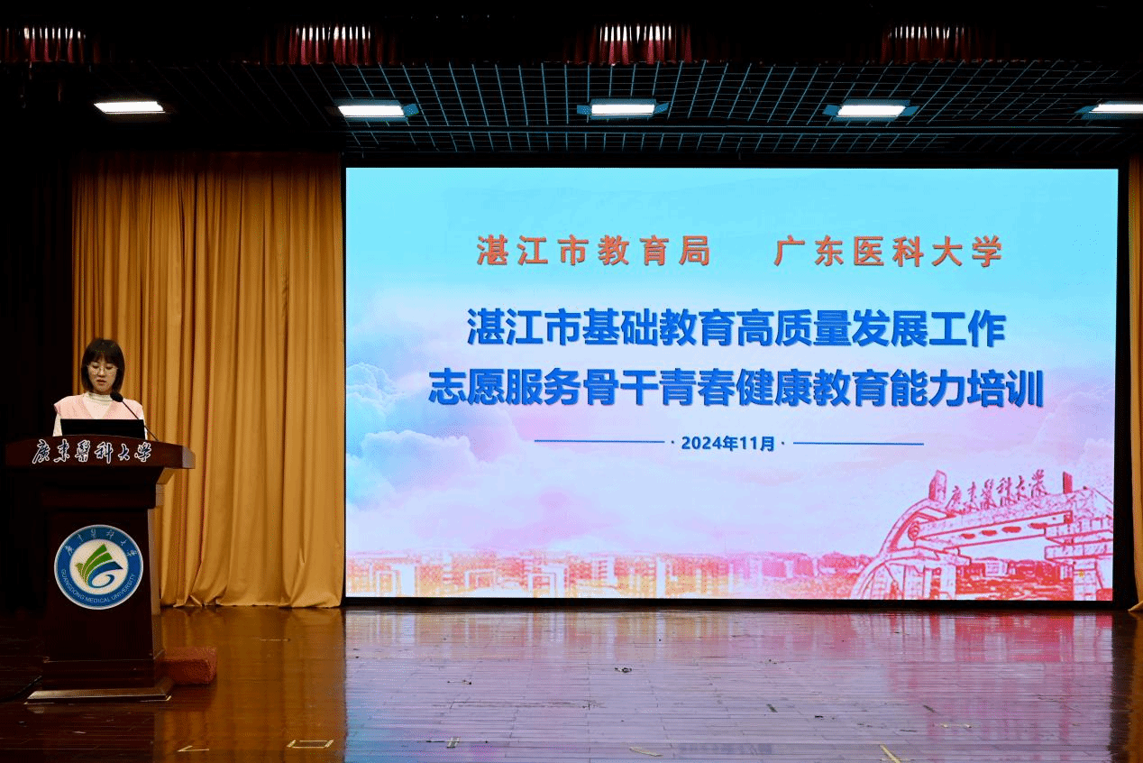11月20日下午,湛江市基础教育高质量发展工作志愿服务骨干青春健康教育能力培训在广东医科大学湛江校区成功举办,来自县市区教育局、各直属学校选派的近百名中小学志愿服务骨干教师齐聚一趟,探讨青少年青春期生理、心理教育的新渠道、新方法。