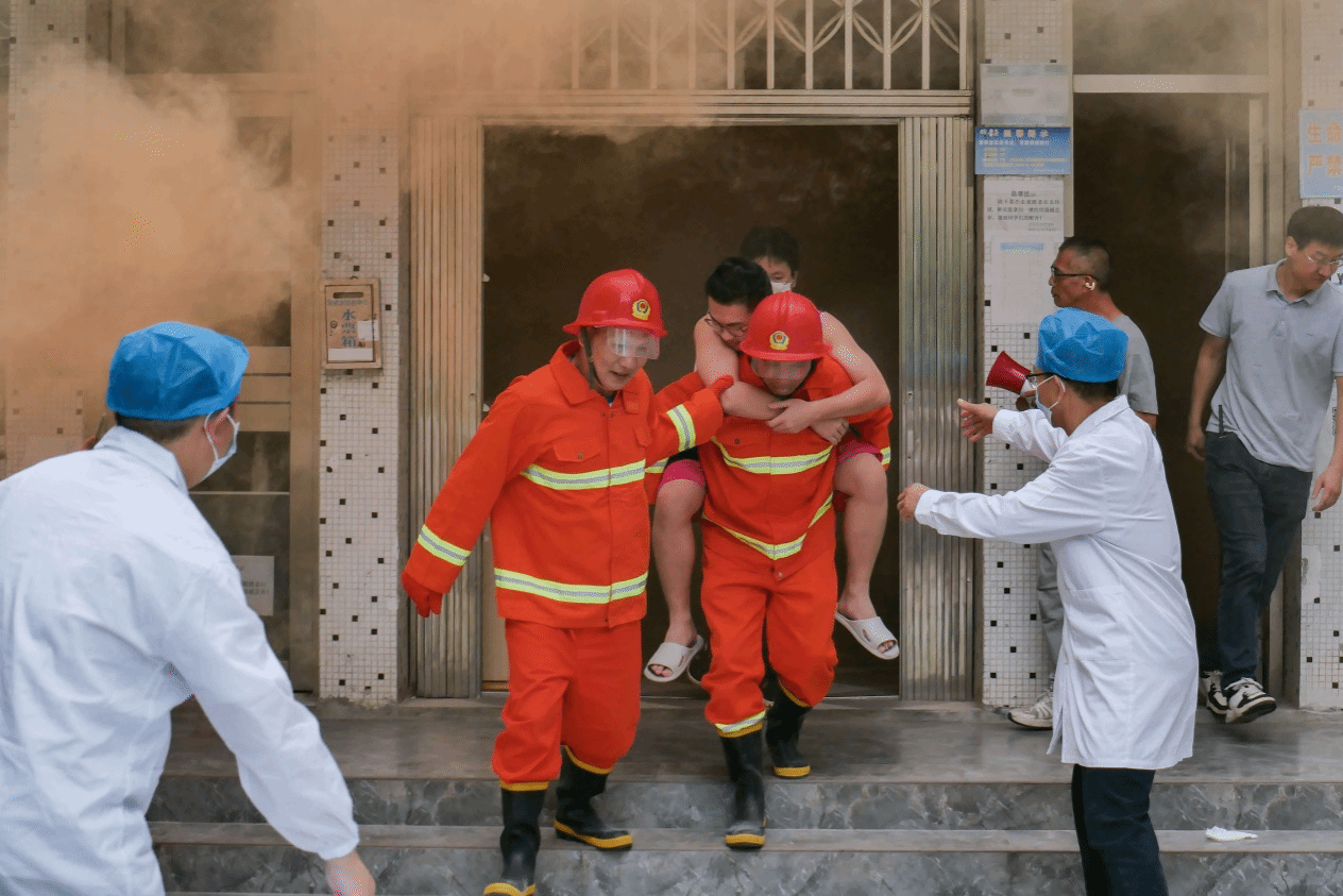 在疏散过程中,同学们捂住口鼻,在疏散引导组的指引下,迅速而有序地撤离至安全地带,整个过程仅用时1分多钟。与此同时,消防应急分队和医护救援队也火速抵达现场,消防员们身着专业装备,手持水枪,果断冲向火源进行扑救;医护救援队则与先遣人员紧密配合,对受伤人员进行心肺复苏等紧急救护,并将重伤员迅速送往医院进一步治疗。