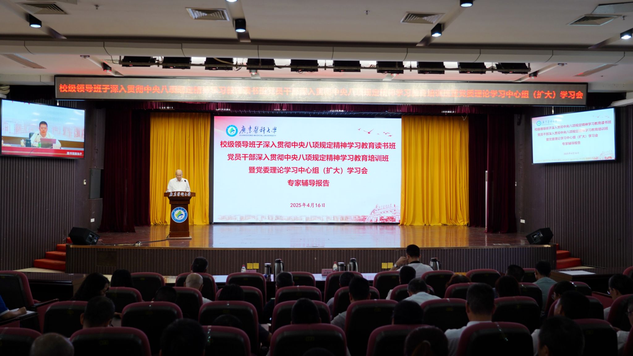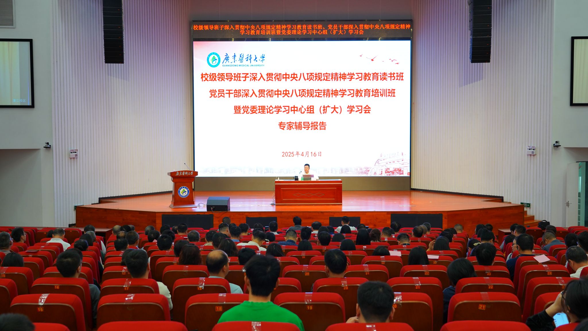 2025年4月16日下午,学校举行校级领导班子读书班、党员干部培训班暨党委理论学习中心组(扩大)学习会议,专题学习贯彻中央八项规定及其实施细则精神。广东省委党校党建研究中心副主任张克兵副教授作专题辅导报告。学校党委书记、校长卢景辉主持报告会。