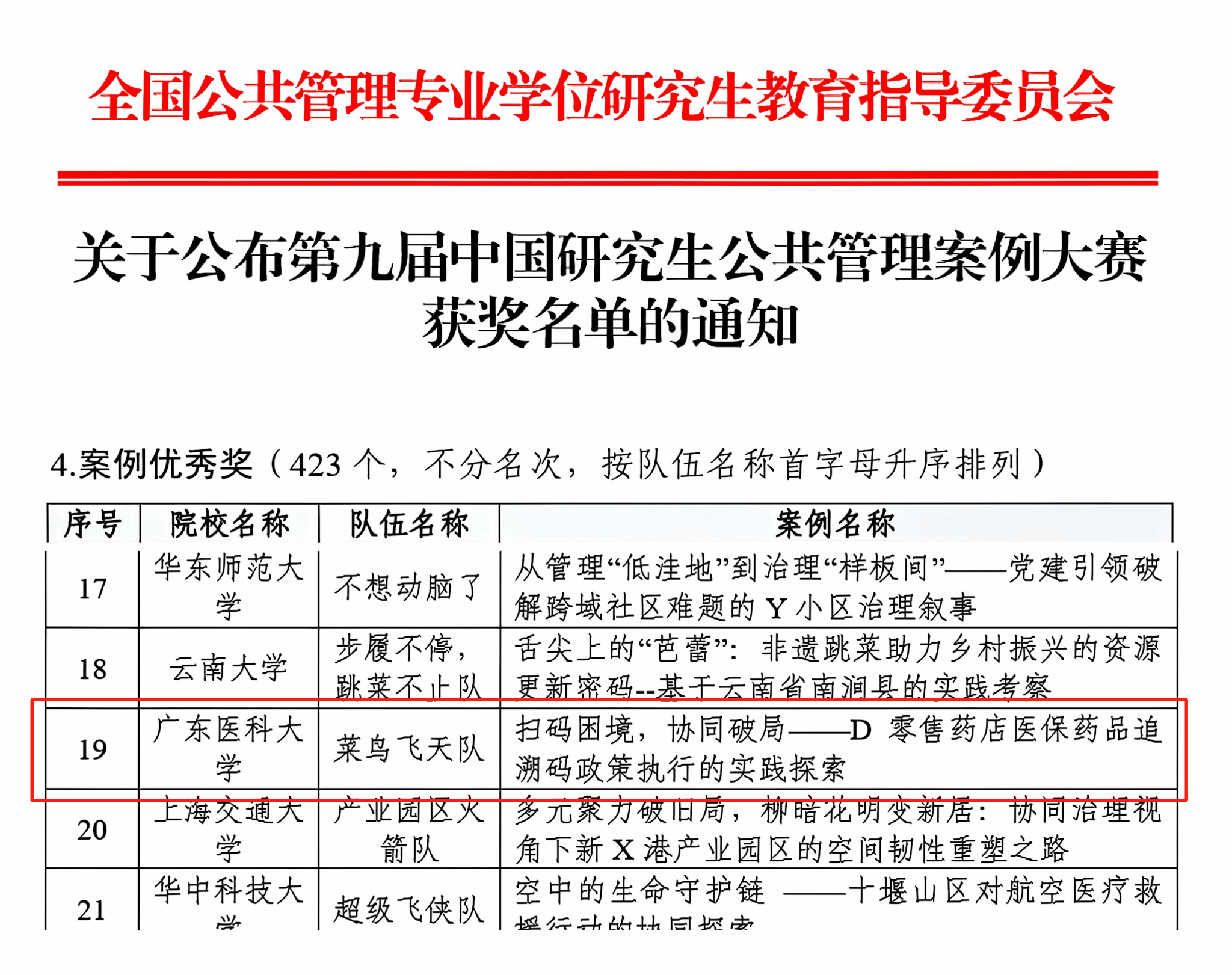 近日,第九届中国研究生公共管理案例大赛圆满落幕。本次大赛吸引来自全国268所院校的3115支队伍报名参赛,参赛师生1.53万人,竞争激烈。我校人文与管理学院2023级mpa“菜鸟飞天队”凭借案例《扫码困境,协同破局——d零售药店医保药品追溯码政策执行的实践探索》,在全国3115支参赛队伍中强势突围,成功跻身全国前20%,获得案例优秀奖。该案例由2023级mpa研究生林蔚同学担任队长,队员为2024级研究生朱倩莹、胡宏鹏,指导老师为陈小嫦、肖俊辉。
