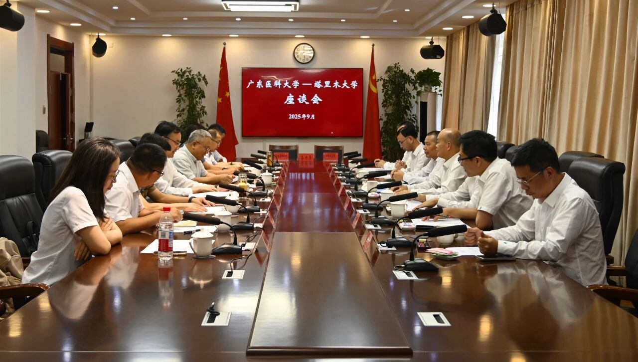 塔里木大学党委副书记、校长闫祥林详细介绍了塔里木大学的基本情况。他指出,塔里木大学地处南疆腹地、大漠深处,是一所有着光荣传统的学校。建校60余年来,这座“沙漠学府”强化为党育人、为国育才的导向,坚持用胡杨精神育人、为兴疆固边服务,培养了一批批“下得去、留得住、用得上、干得好”的“胡杨学子”,为新疆尤其是南疆经济社会高质量发展作出了突出贡献。他希望今后能进一步加强与广东医科大学的合作,推动学校事业高质量发展再上新台阶。