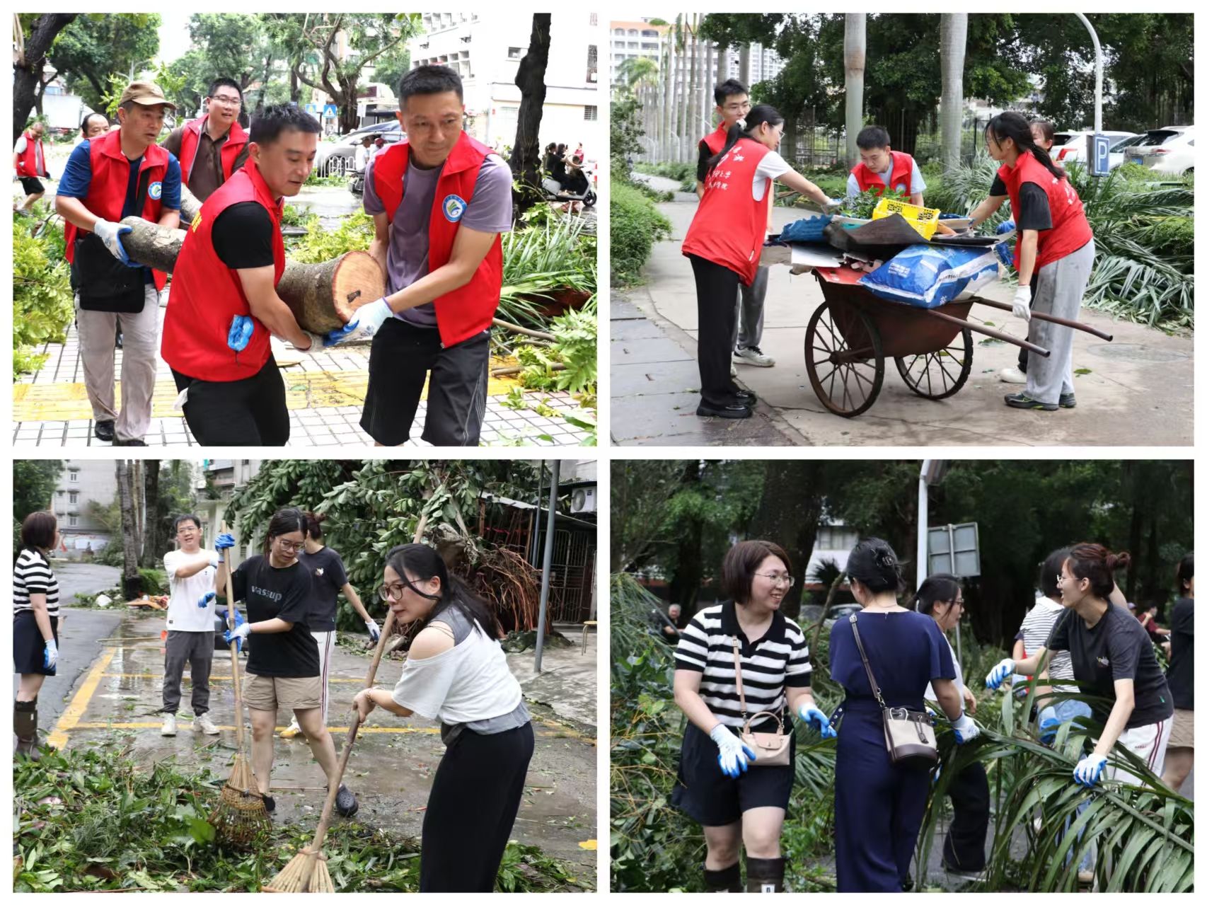 海洋与热带医学学院师生或合力搬开倒伏树干,或细致清理路面断枝杂物,并与学校设备处、后勤处相关工作人员一同检查实验楼受损情况,彻底消除安全隐患。