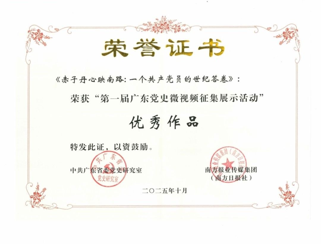 10月14日,中共广东省委党史研究室与南方日报、南方 客户端联合举办的“第一届广东党史微视频征集展示活动”成果发布仪式在广州举行。发布仪式介绍了活动取得的成果,并向有关单位和个人颁发了和记娱乐手机版下载的荣誉证书。我校宣传部选送的《赤子丹心映南路:一个共产党员的世纪答卷》获评优秀作品。