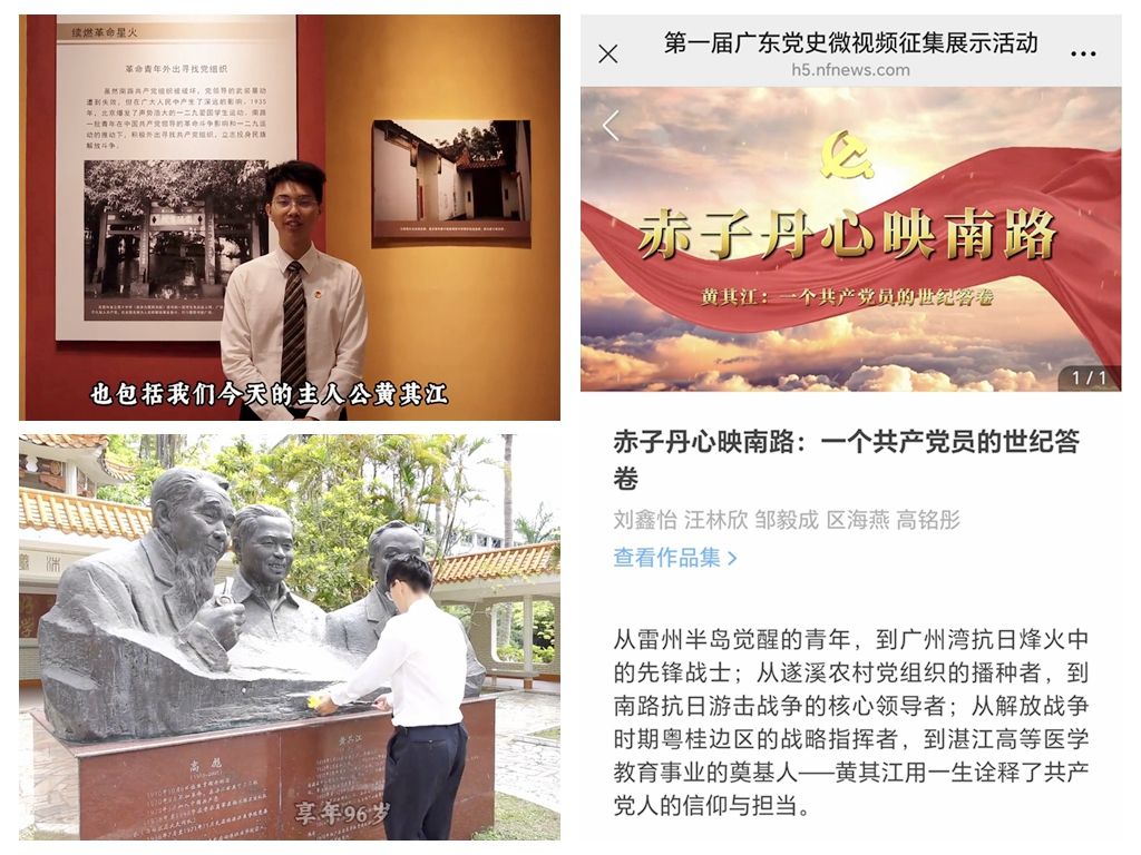 该作品由宣传部周圆老师指导,我校学子刘鑫怡、邹毅成、高铭彤、区海燕、汪林欣等同学共同拍摄制作。他们用镜头追寻南路革命先驱、我校老领导黄其江的足迹,将革命者的信念与抗战岁月里千万人的坚守编织成光。