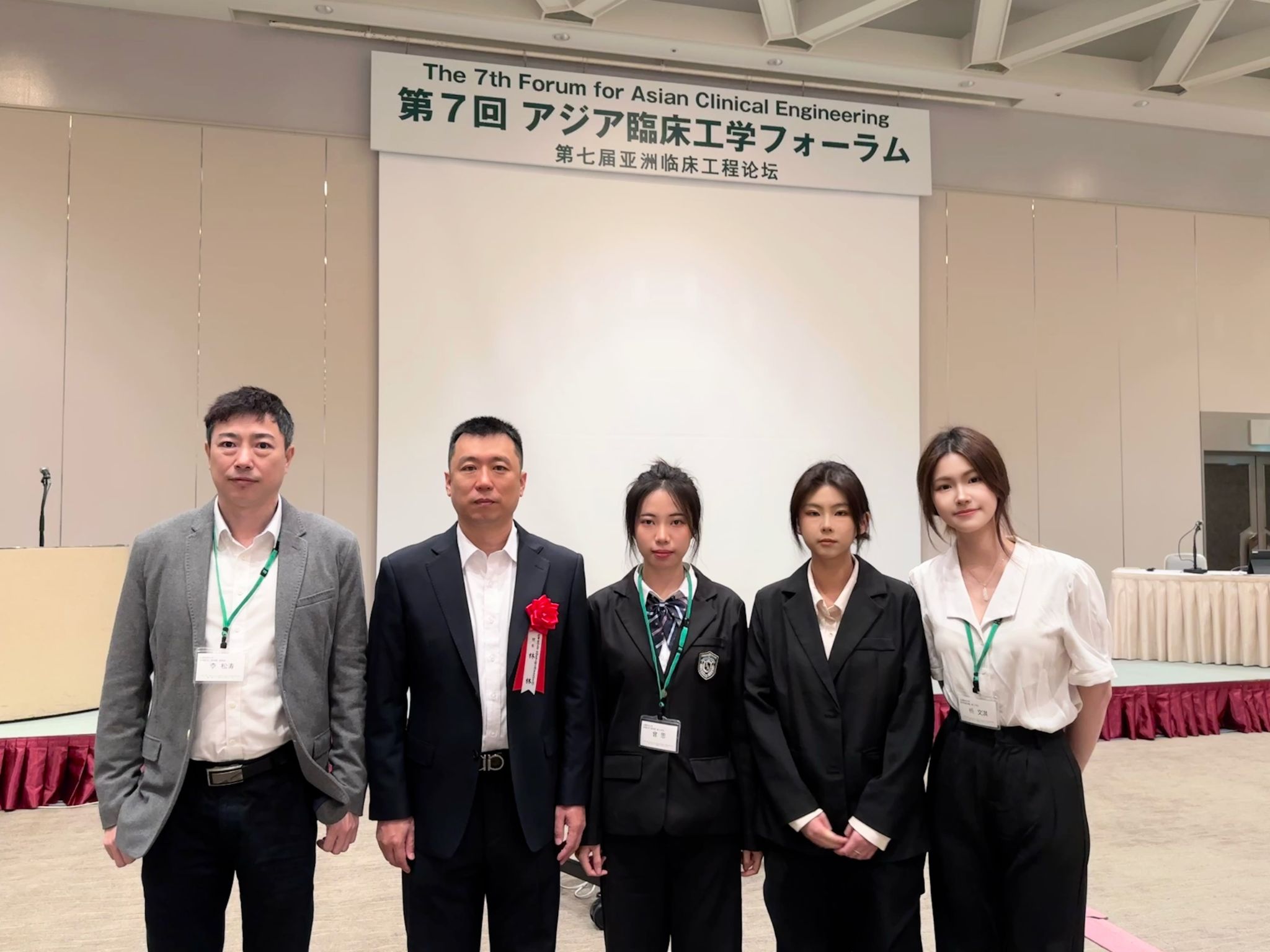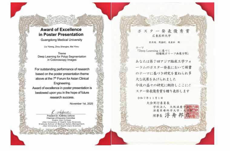 广东医科大学的医工学生科研代表曾思、杨文淇、杜佳颖、程灿(指导老师)、何晓雪(指导老师)的《基于眼部智能检测与近视预防及理疗的可穿戴设备研究》和刘奕增、周盛柯、麦茵茹的《基于深度学习的结肠镜息肉图像分割》在论坛的壁报展进行展示。经过大会评选,《基于深度学习的结肠镜息肉图像分割》壁报获得优秀壁报奖。广东医科大学的积极参与,不仅展示了中国高校在临床工程教育与科研创新方面的实力与担当,也为推动亚洲地区的医学工程合作与交流贡献了“广东医智慧”。