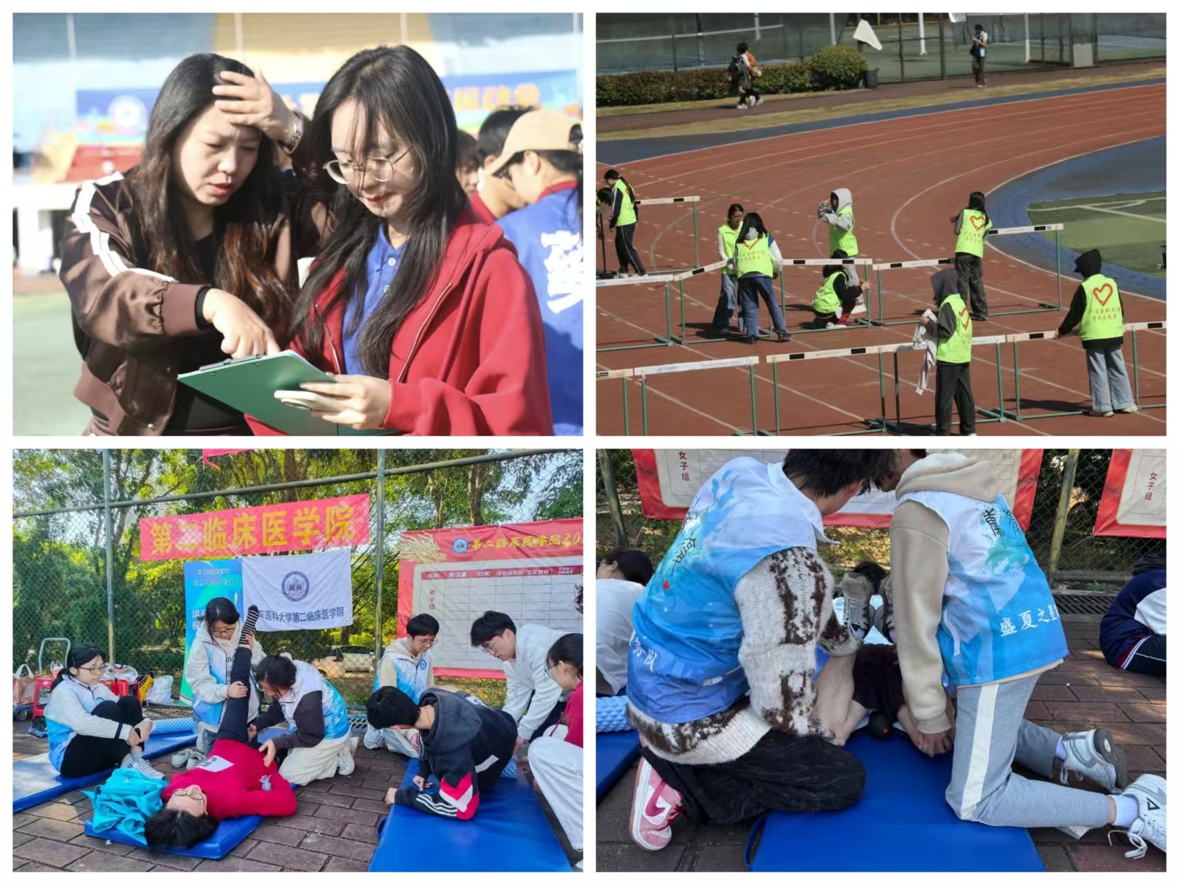 赛场内外,温情与奉献无处不在。志愿者们默默付出,裁判员们秉公执裁,确保了赛事顺利进行。第二临床医学院康复医学系师生发挥专业特长,为运动员提供贴心的赛后拉伸服务。观众们热情呐喊助威,特别是由第一临床医学院设置的“小海豚”玩偶互动点,吸引了众多师生合影,欢声笑语洋溢赛场。趣味运动项目中,团队成员们默契配合,在欢乐中凝聚了集体力量。