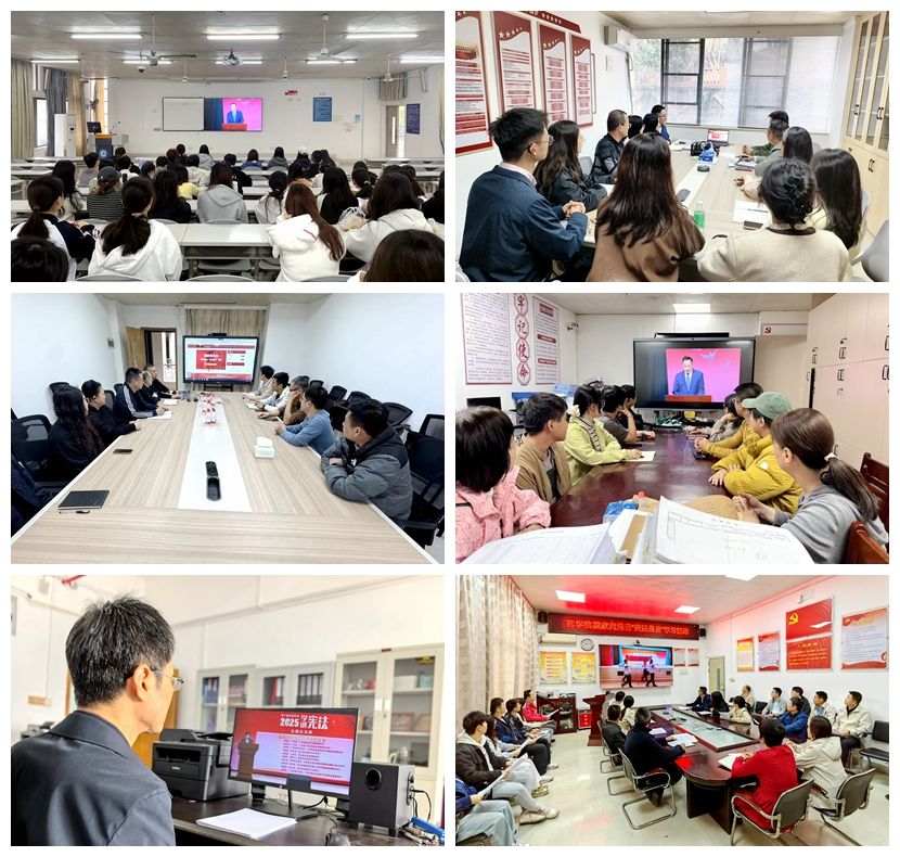 学校在两校区第一会议室设立了集中观看主会场。校领导卢景辉、向献兵、石明,各基层党委(党总支部)书记、学院院长、职能部门负责人及学生代表齐聚一堂,同步收听收看全国主会场活动。升旗仪式结束后,全体参会师生跟随北京主会场主持人的领读,齐声诵读宪法部分条文,在庄重的诵读声中感受宪法权威,深刻领悟宪法作为国家根本法的崇高地位与重要意义。