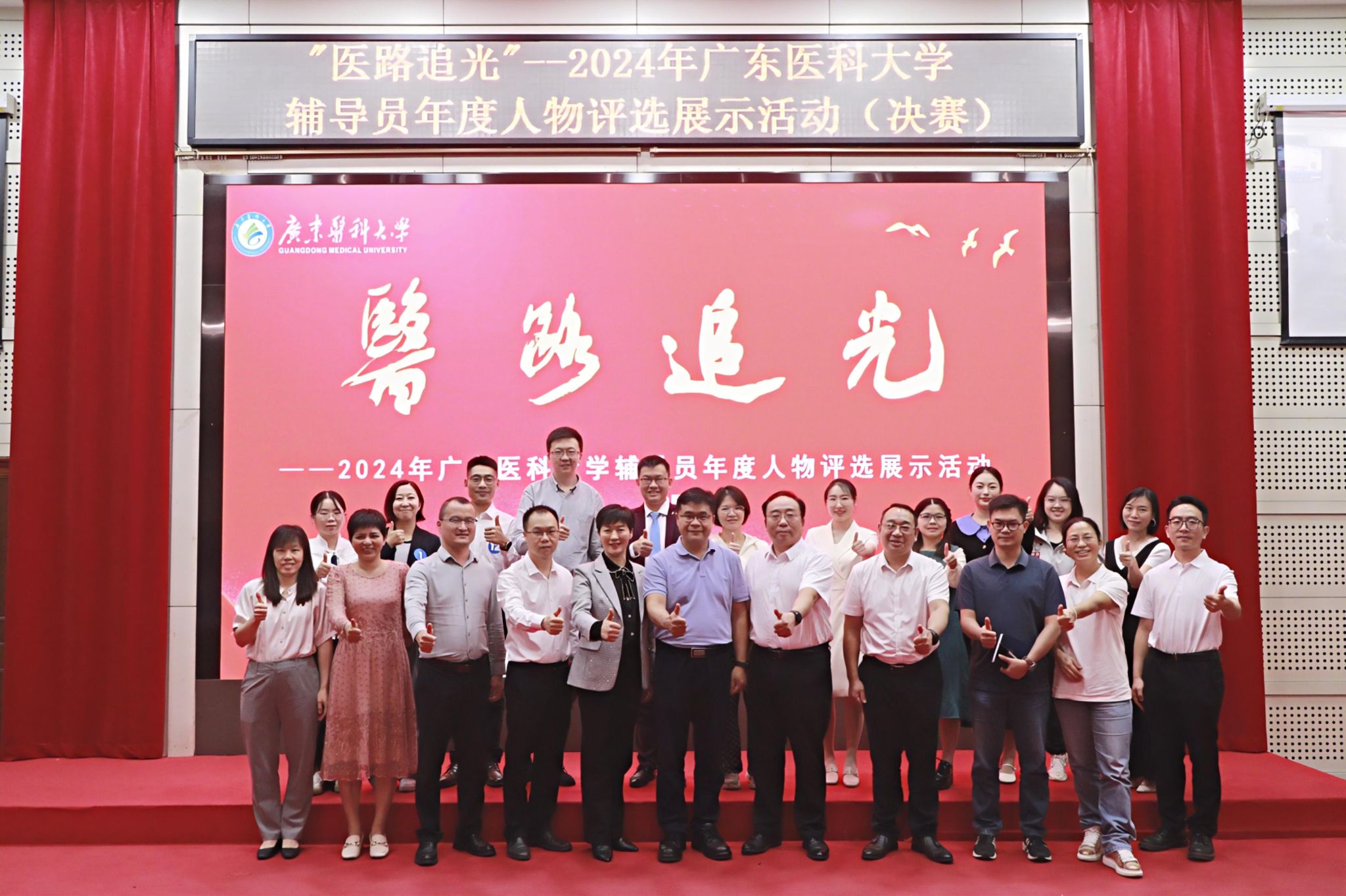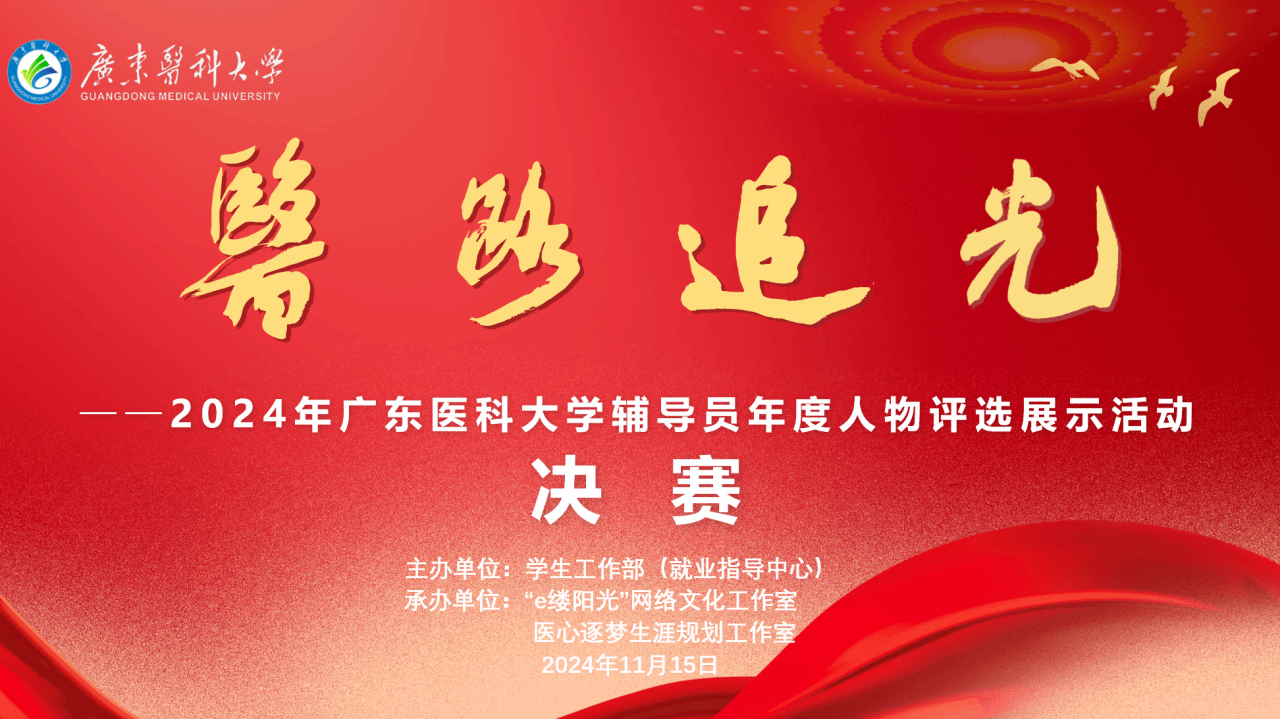 2024年11月15日学校学生工作部举办“医路追光”——2024年广东医科大学辅导员年度人物评选展示活动(决赛)。活动由学生工作部策划主办,由“e缕阳光”网络文化工作室、医心逐梦生涯规划工作室具体承办。