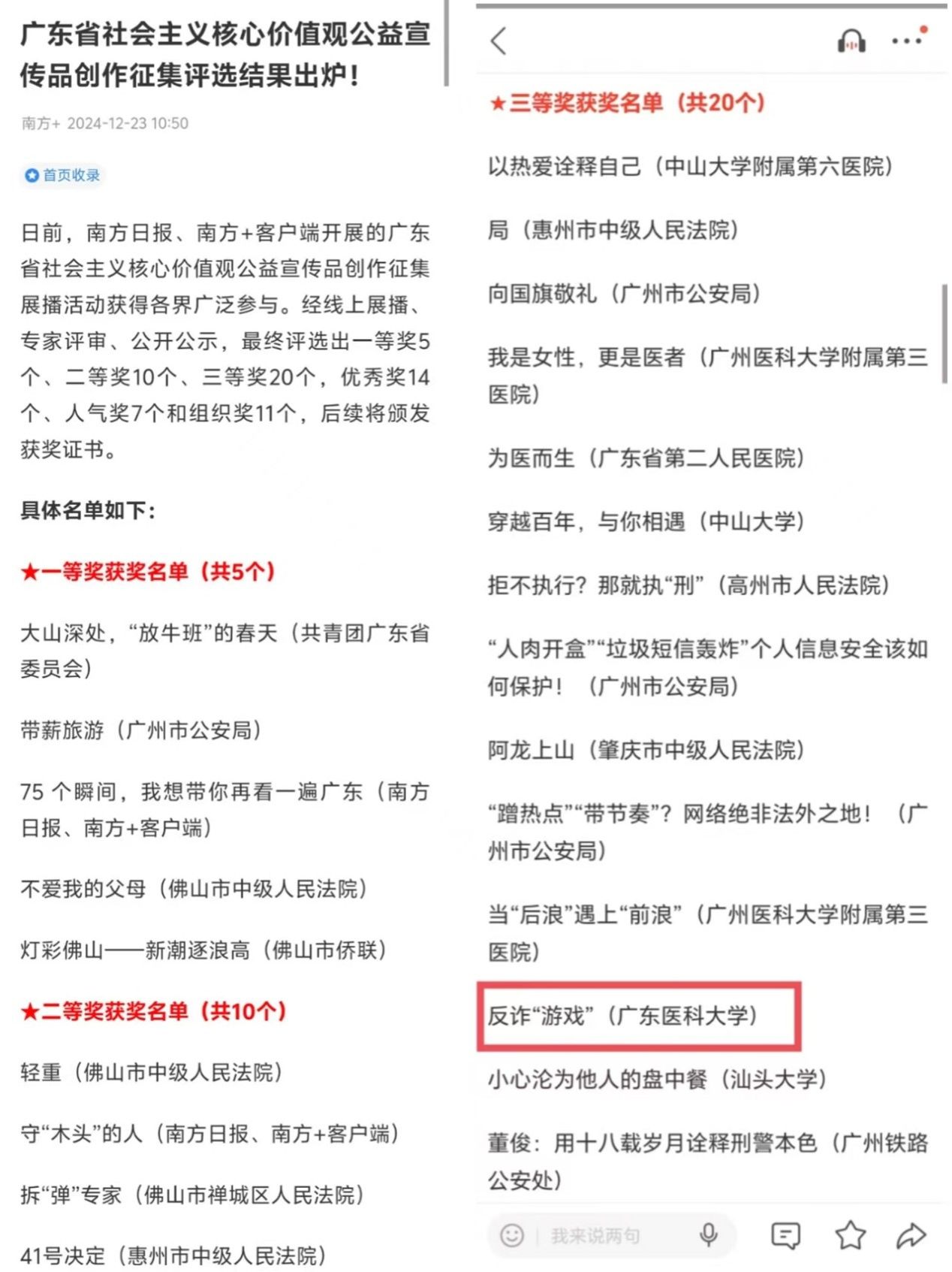 为深入贯彻落实习近平总书记关于社会主义核心价值观建设的重要论述精神,由省委宣传部指导,南方日报、南方 开展的广东省社会主义核心价值观公益宣传品创作征集展播活动于近日满落下帷幕。经线上展播、专家评审、公开公示,最终评选出一等奖5个、二等奖10个、三等奖20个,优秀奖14个、人气奖7个等。其中,由我校周圆、徐畅老师指导,罗淳康、邓芷莹、吴文莉、刘望龙、黄禹诚、符川川、金士博、陈子欣同学组成的参赛团队的作品《反诈“游戏”》荣获三等奖。