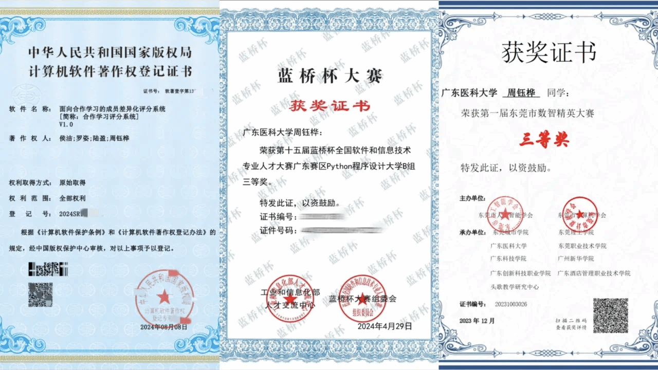 精进学业之余,周钰桦还积极参与各类重要赛事并斩获奖项,包括全国大学生生物医学工程创新设计竞赛三等奖、蓝桥杯全国软件和信息技术专业人才大赛广东赛区python程序设计大学b组三等奖等。
