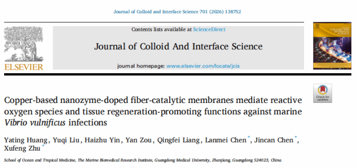 近日,我校海洋与热带医学学院朱旭峰/陈锦灿/陈兰美团队在《journal of colloid and interface science》(中科院一区top期刊,影响因子 9.7)发表了题为“copper-based nanozyme-doped fiber-catalytic membranes mediate reactive oxygen species and tissue regeneration-promoting functions against marine vibrio vulnificus infections”的研究论文。本工作以创伤弧菌为研究对象, 设计开发了一种抗菌和促修复的多功能纳米催化膜,用于治疗创伤弧菌感染创面。