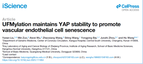 2025年2月21日,广东医科大学周军智团队与杭州师范大学汪虎团队、中南大学湘雅医院柏勇平团队共通讯在国际知名期刊iscience(cell新子刊jcr q1)上发表题为“ufmylation maintains yap stability to promote vascular endothelial cell senescence”的研究论文,发现内皮细胞yap是新型ufmylation修饰底物,该修饰增加了其蛋白稳定性。有趣的是,衰老的内皮细胞中ufmylation修饰活性增加进一步促进了的yap稳定性,进一步导致衰老内皮细胞中yap的积累,加剧内皮细胞衰老表型。靶向yap-ufmylation修饰,可以改善内皮细胞衰老,同时减轻老年小鼠的心血管衰老表型。该研究首次发现了ufmylation修饰与衰老生物学的联系,也为心血管衰老提供潜在靶点。