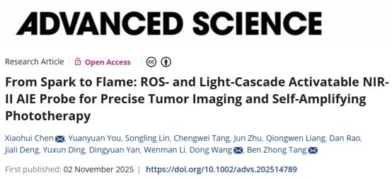 近日,广东医科大学医学技术学院陈晓辉团队联合香港中文大学(深圳)唐本忠院士/深圳大学王东教授,在国际权威期刊《advanced science》发表了题为“from spark to flame: ros- and light-cascade activatable nir-ii aie probe for precise tumor imaging and self-amplifying phototherapy”的研究论文,开发了一种ros和近红外光级联激活的nir-ii aie诊疗探针,实现肿瘤的精准成像与放大光疗。