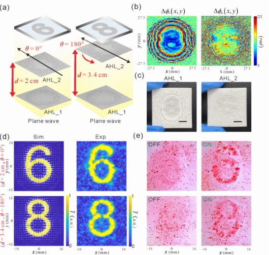 图 2 展示了该器件的三维声全息加密与瞬时视觉解密原理及实验验证。其中,图 2(a)为技术概念图,呈现通过调控级联声全息透镜相对距离、旋转角度作为额外密钥,并结合 pdms 微粒操控实现核心功能的设计思路;图 2(b)和(c)分别为两块声全息透镜的计算相位分布及 3d 打印样品。实验结果显示,当两个级联声全息透镜相对距离为 2cm、旋转角度为 0° 时,入射平面声源经调制后,在声学窗内形成数字“6”的重建声场(图 2(d)),并通过声辐射力驱动彩色 pdms 粒子自组装成图案 “6”(图 2(e));当相对距离调整为 3.4cm、旋转角度为 180°时,粒子则自组装成图案 “8”,成功实现三维声全息加密与瞬时视觉解密功能。