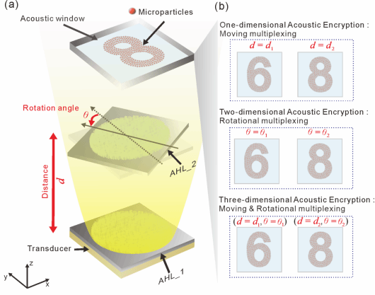 这种紧凑声学加密器件采用创新策略大幅提升了信息编码自由度,从而构建起更严密的物理安全屏障。如图1所示,该器件突破了传统加密维度限制,除常规相位分布外,还将两个级联声全息透镜间的相对距离和相对旋转角度作为额外加密密钥,从而实现多维信息加密。其核心亮点在于实现瞬时可视化解密:当两个级联声全息透镜的密钥(距离与旋转角度)正确匹配时,重建声场产生的特定声辐射力,可驱动声学窗内的彩色 pdms 粒子在数秒至数十秒内迅速自组装成加密图案(如数字、字母等),无需任何辅助电子扫描设备或后期图像处理,即可完成即时视觉解密。