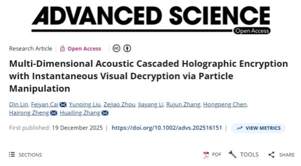 近日,我校生物医学工程学院(未来技术学院)张怀岺教授、林勤副教授团队联合中国科学院深圳先进技术研究院蔡飞燕研究员在国际知名学术期刊《advanced science》(中科院 1 区 top 期刊,影响因子 14.1)发表题为 “multi-dimensional acoustic cascaded holographic encryption with instantaneous visual decryption via particle manipulation” 的研究论文。团队首次将多维复用级联声学全息术与微粒操控技术相融合,研发出紧凑式声学加密器件,成功实现多维信息加密与数十秒级瞬时视觉解密,为声学加密技术的实用化发展迈出关键一步。